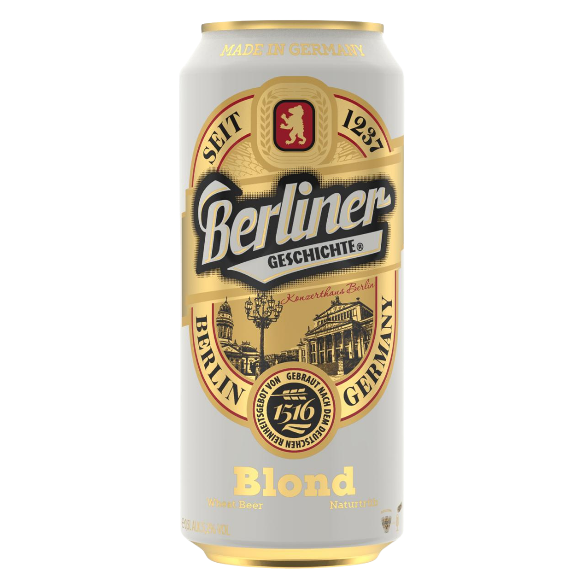 Germany’s smooth Blond wheat beer, Berliner Geschichte Blond, features a light golden color and a soft, refreshing character. It opens with gentle fruity aromas, complemented by subtle notes of wheat and a mild sweetness.